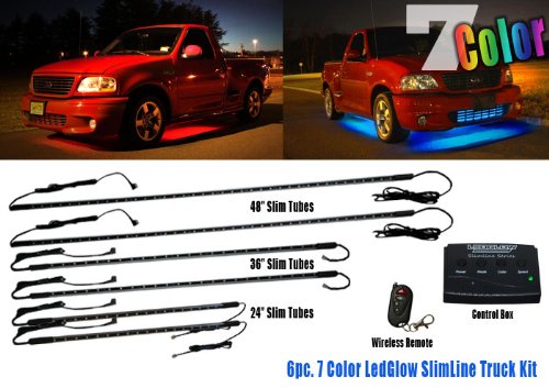 LEDGlow's 6pc 7 Color Slimline LED Underbody Kit is the perfect way to add multi color underbody accent lighting to any truck at a great price. Featuring 324 ultra bright, wide angle LEDs housed in two 24 inch, two 36 inch and two 48 inch high impact, water resistant tubes that are only 5/8ths of an inch in diameter! The lighting functions on this kit are easily operated by the included wireless remote or by using the buttons located directly on the control box. The control box offers 7 solid color modes, 6 flash patterns, 6 scan modes, 2 chase modes, 2 sound activation modes, as well as 2 color cycle modes. Also included are three different speed modes for any of the available lighting functions, and a red LED will illuminate when the underbody kit is in a sound activation mode. This kit is expandable and will allow you to easily add up to two additional 7 color slimline tubes. With the included mounting hardware, 6 feet of power wire, and modular connectors that allow you to daisy chain each underbody tube to the next, this kit is easily installed. LEDGlow offers lifetime technical support and a one year warranty with every underbody lighting kit purchased.