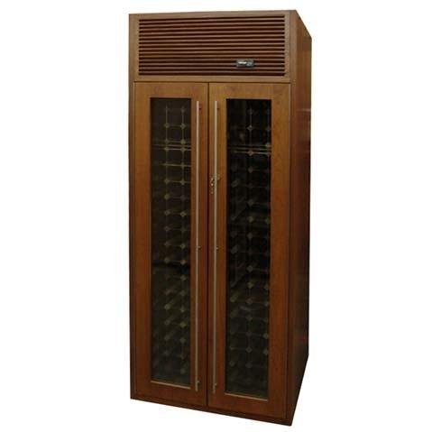 Vinotemp VINO-350FEC 240 Bottle Wine Cellar With Front Exhaust - Glass Doors / Cherry Cabinet. VINO-350FEC. All Wine Refrigerators. This Wine Cellar with front exhaust features a Cherry wood exterior with Fruitwood stain. Vinotemp Wine Cellars are all-in-one wine storage solutions hand-crafted with domestic woods in Southern California. They maintain an ideal environment for both short-term storage and long-term aging for all types of wines keeping the temperature at 55 degrees and level of humidity at 50-70 , much like the cool caves used to store wine in France. (Capacity varies with size and shape of bottle. ) Dimensions: (38 inchW x 29 inchD x 82 inchH).